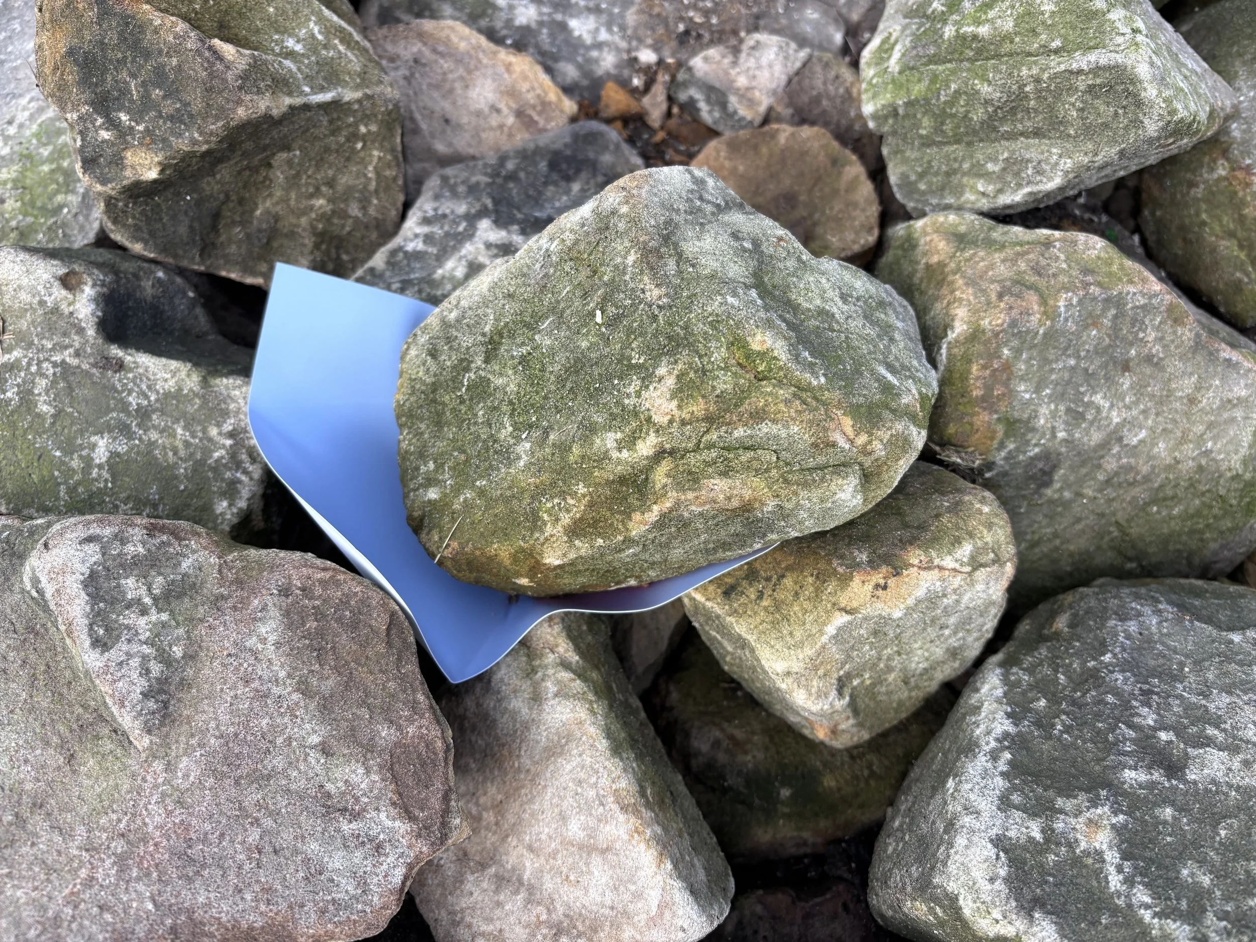 Like the cairn itself, the assemblage of individual objects in Connected Presence (2026) has no beginning or end, it is always in the middle. Informed by Deleuze and Guattari’s definition of the rhizome, there are multiple entry points (TP 22), meaning for a reversible, malleable and non-hierarchical system of organisation. The network and organisation of individual prints is modifiable, just as the individual stones are within the body of the cairn. Made through the contact between stones, each print is an intermezzo of the cairn, a state explored by Deleuze and Guattari as that which is in-between (TP 26).