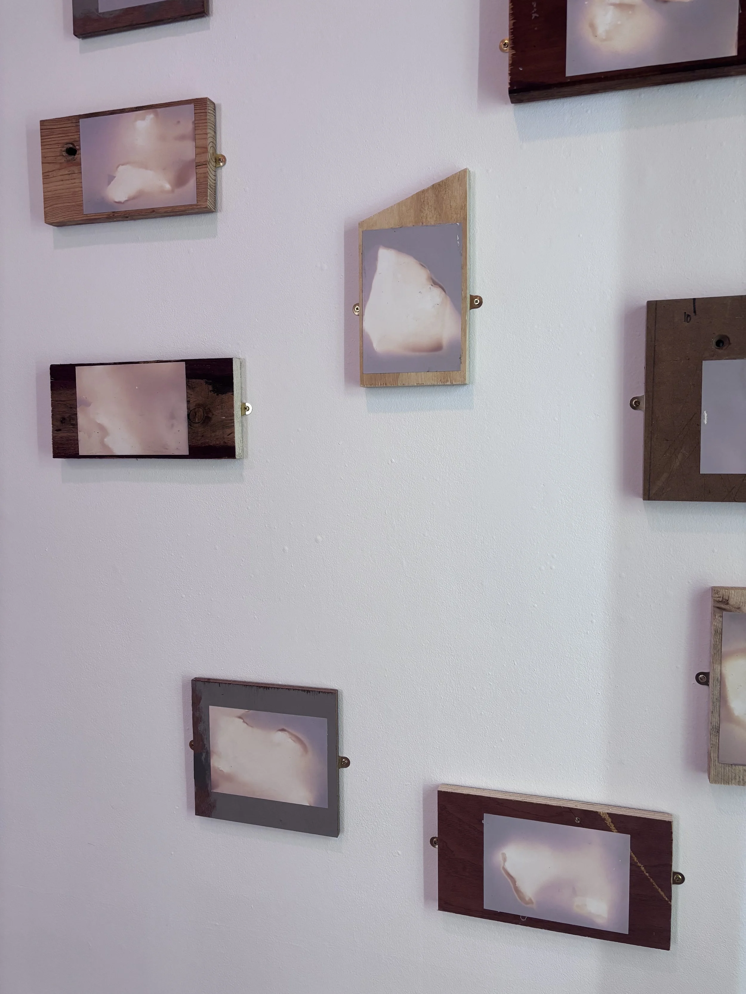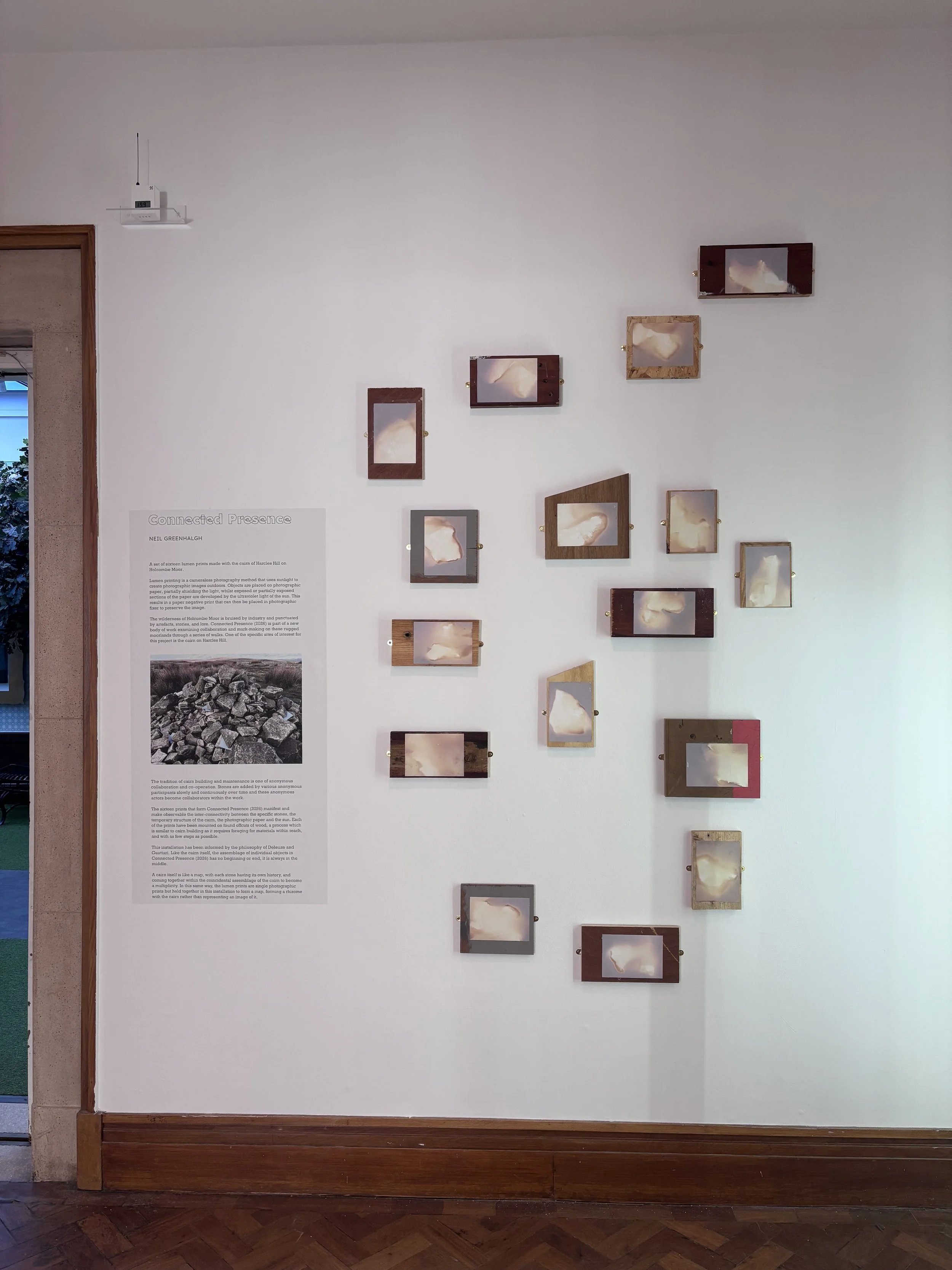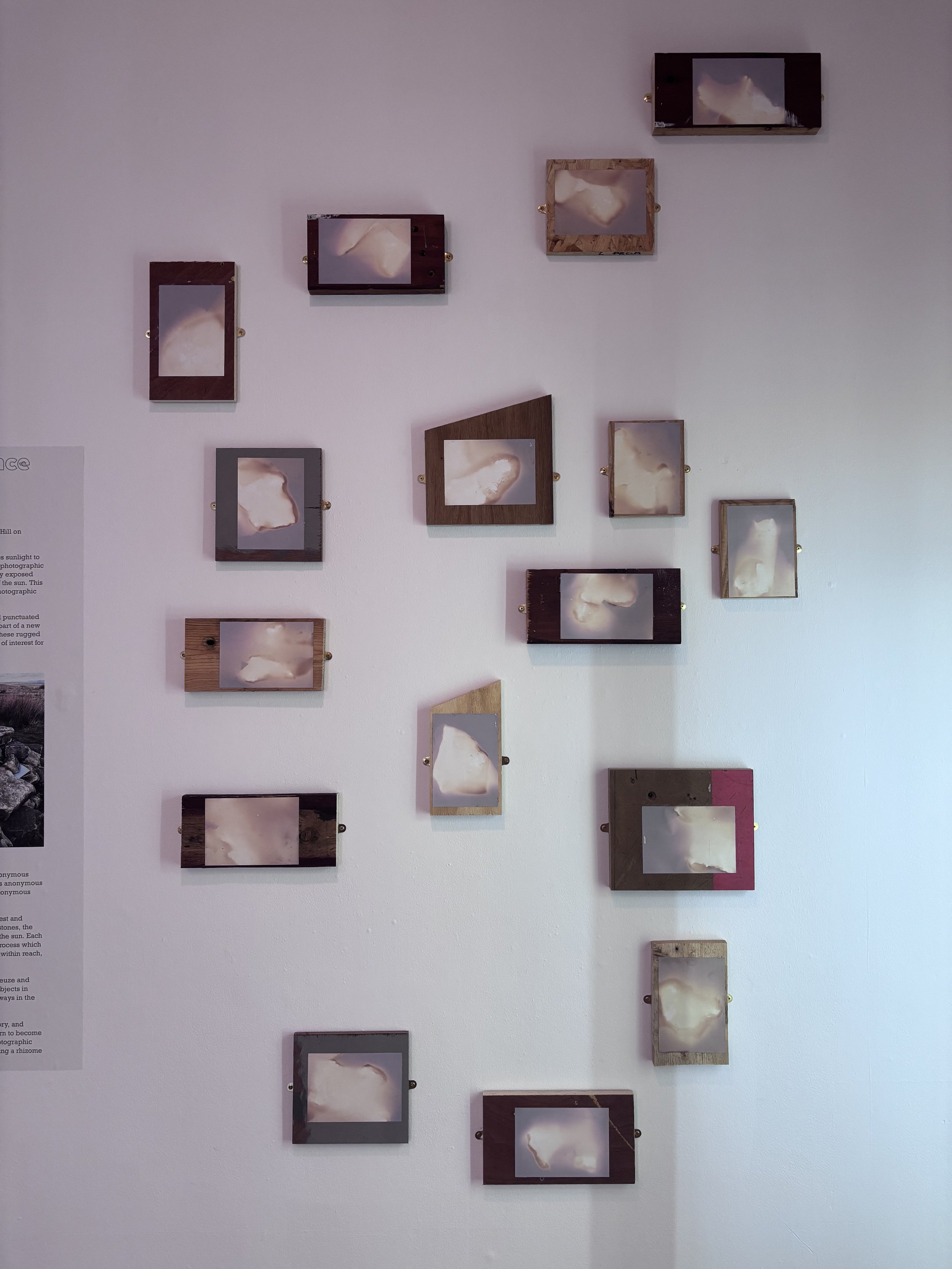 I wanted to replicate the idea of cairn building within the exhibition itself. To do this, each of the prints have been mounted on found offcuts of wood from the workshop at the university where I work. Where possible the wood was not cut further, and there no consideration of hierarchy, or even conscious choice, that determined which prints would go on each board. It would be quite unusual to chuck a rock onto a cairn with deep considerations for aesthetics and so it was important to consider the mounting of these lumen prints as one would consider the building of a cairn - foraging for materials within reach, and with as few steps as possible. Perhaps Deleuze and Guattari would describe this process as Becoming-cairn.