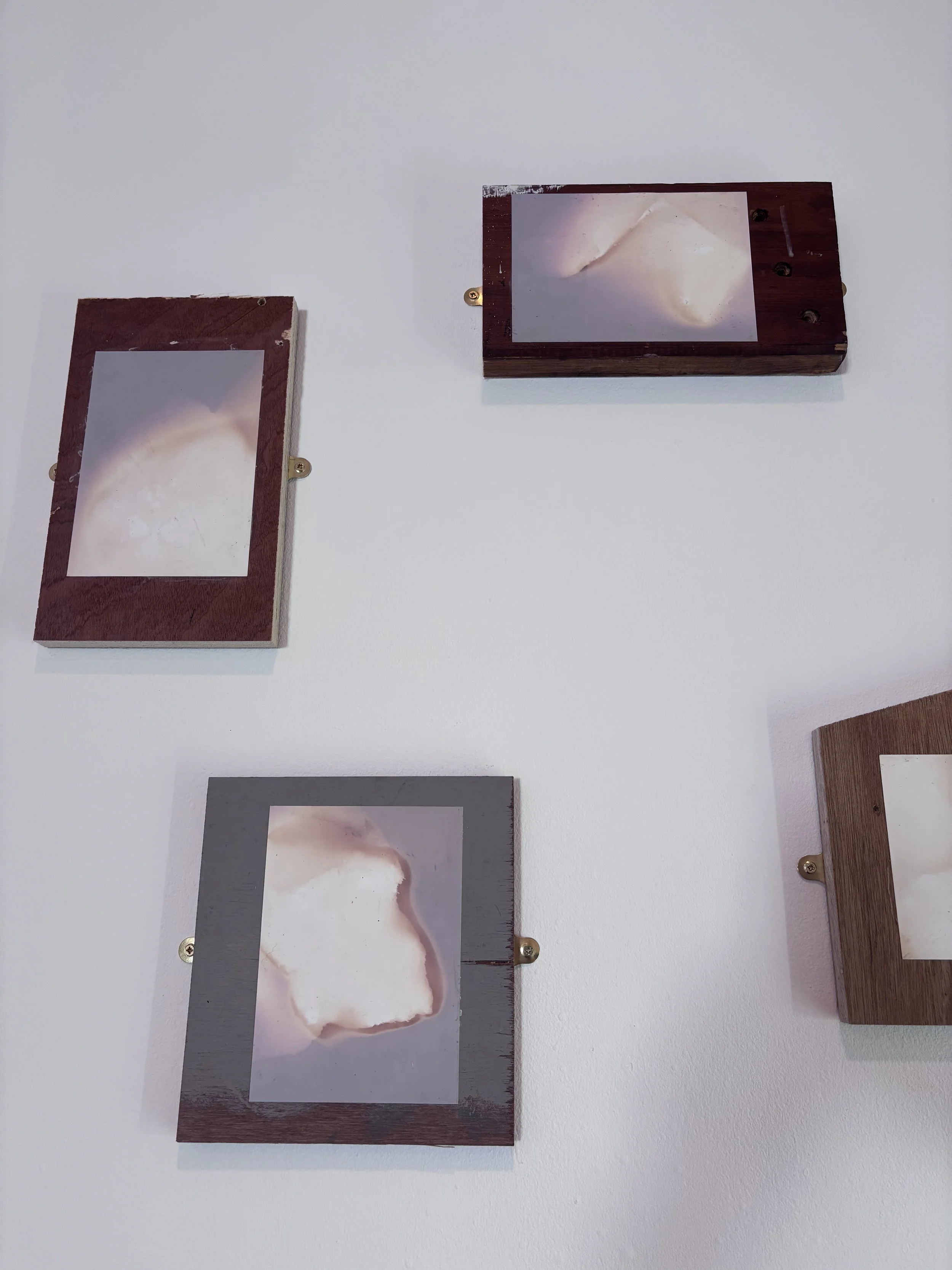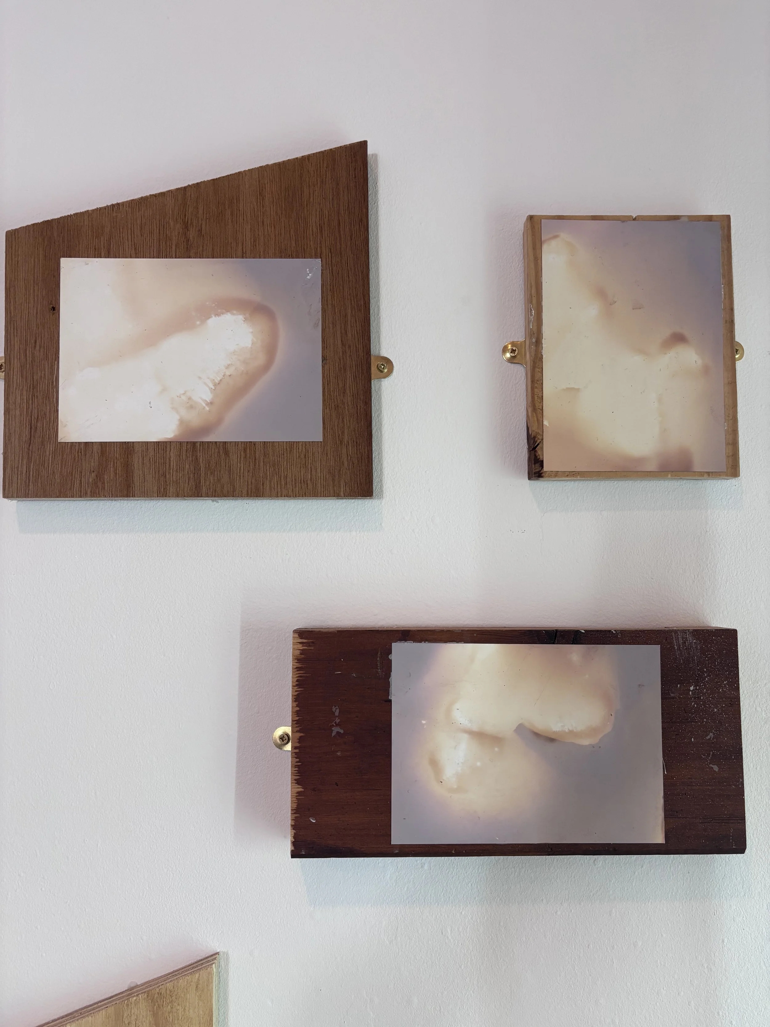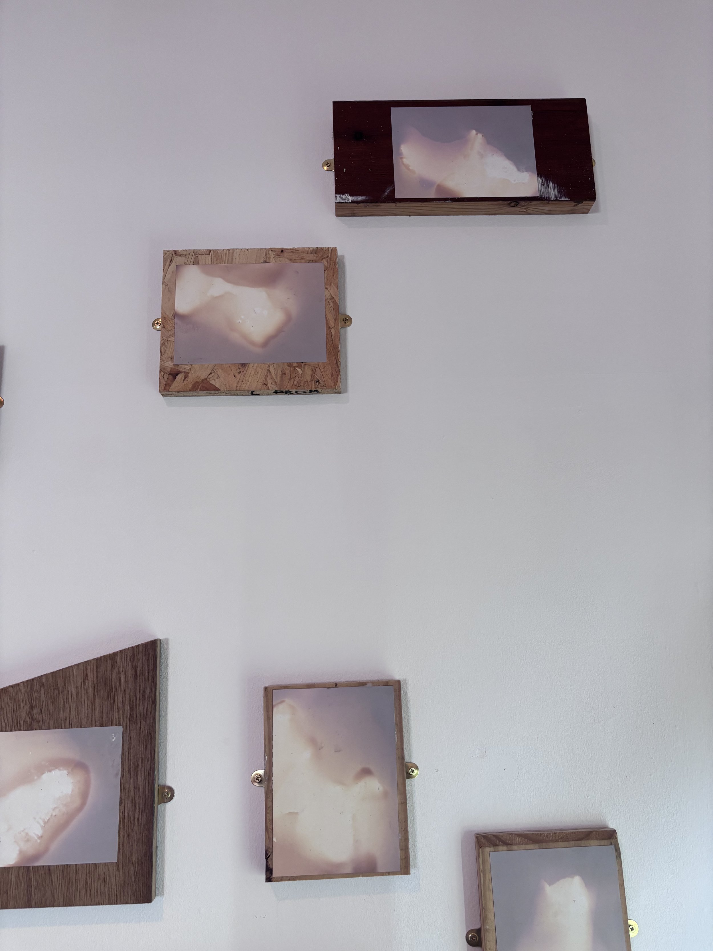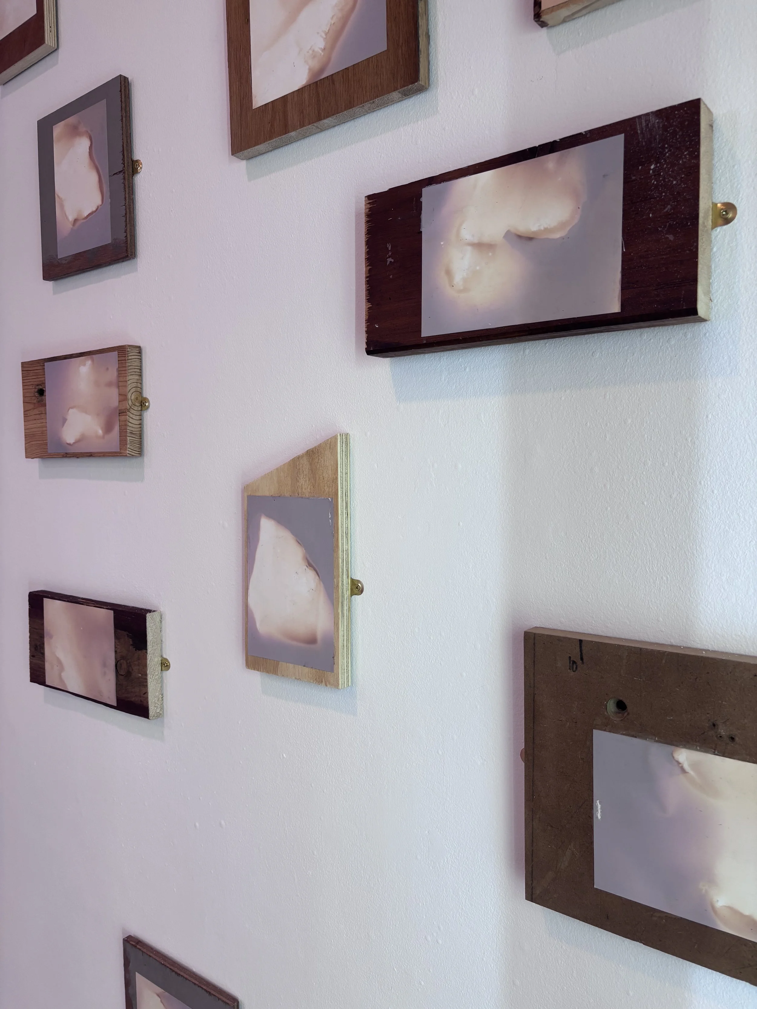 I wanted to replicate the idea of cairn building within the exhibition itself. To do this, each of the prints have been mounted on found offcuts of wood from the workshop at the university where I work. Where possible the wood was not cut further, and there no consideration of hierarchy, or even conscious choice, that determined which prints would go on each board. It would be quite unusual to chuck a rock onto a cairn with deep considerations for aesthetics and so it was important to consider the mounting of these lumen prints as one would consider the building of a cairn - foraging for materials within reach, and with as few steps as possible. Perhaps Deleuze and Guattari would describe this process as Becoming-cairn.
